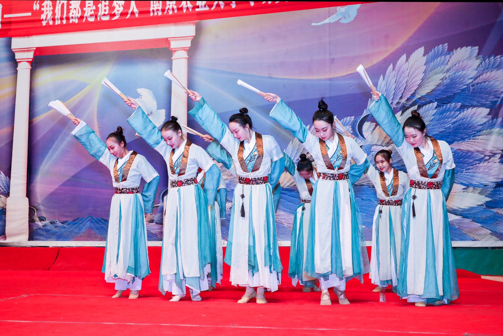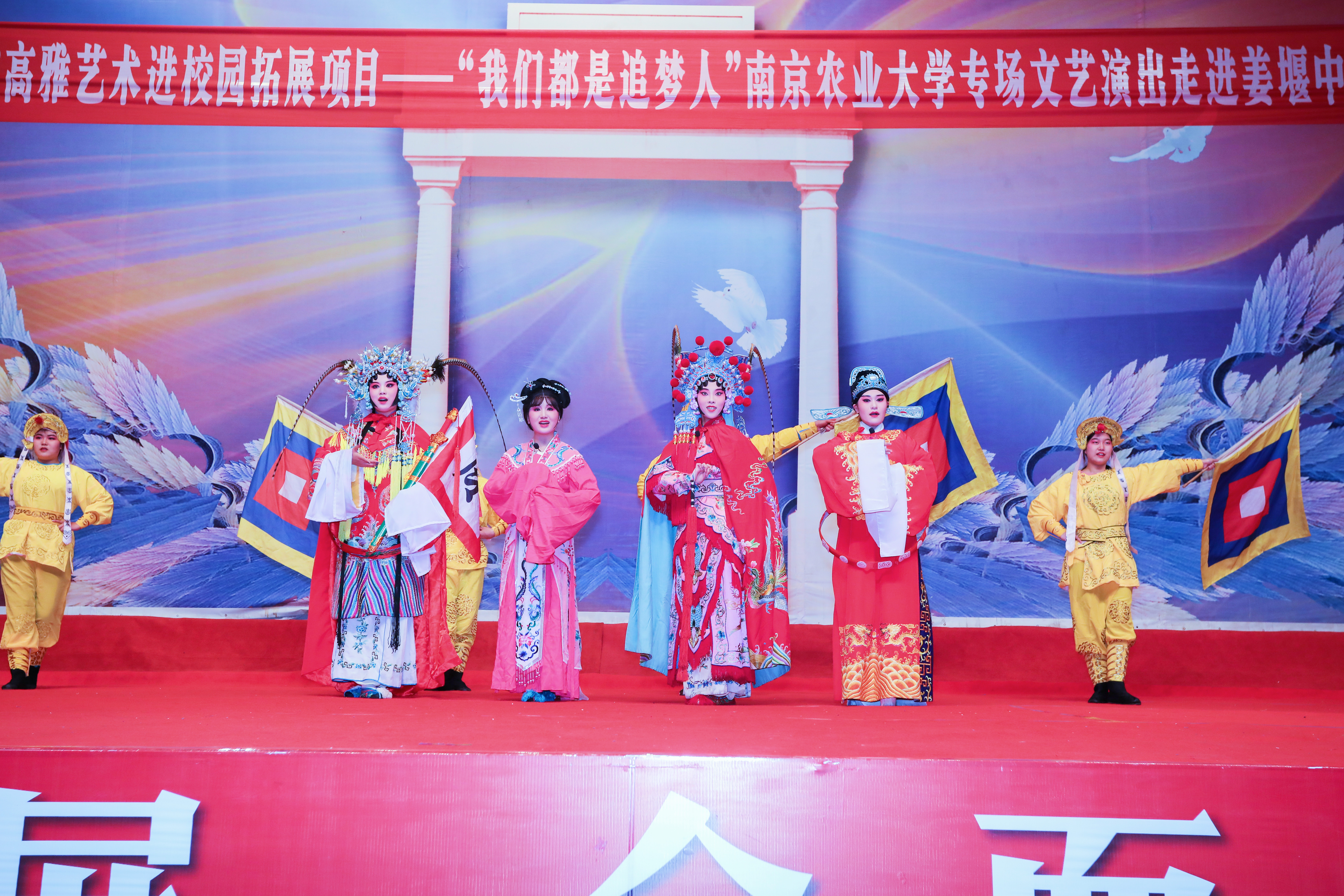 在随后的演出中,我校大学生艺术团演出的原创舞蹈《红》、朗诵《荣光岁月》、戏曲联唱《戏曲中国》、器乐表演《后浪狂想曲》、音诗画《今天,我们这样爱国》等节目,通过多种艺术形式将红色经典、传统文化带进姜堰中学,为师生们上了一趟生动的美育素养课。