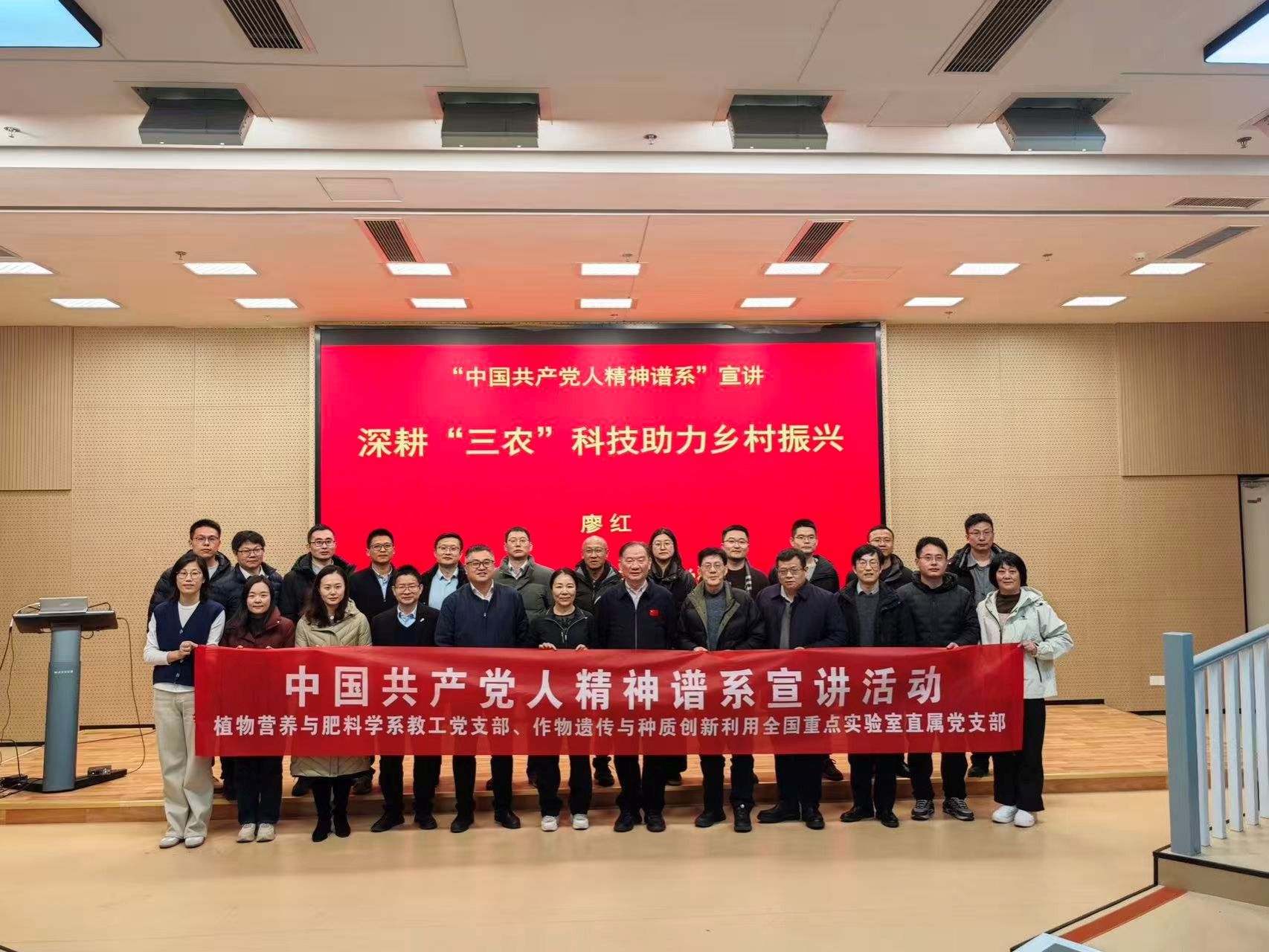 2026年1月11日,我校教育部“强国行”专项行动团队植物营养与肥料学系教工党支部,与作物遗传与种质创新利用全国重点实验室直属党支部开展支部共建活动。活动特邀“中国共产党人精神谱系”宣讲团成员、福建农林大学资源与环境学院根系生物学研究中心主任廖红教授来校,作“中国共产党人精神谱系”专题宣讲。中国工程院院士沈其荣与两个支部全体成员一同在现场聆听了报告。