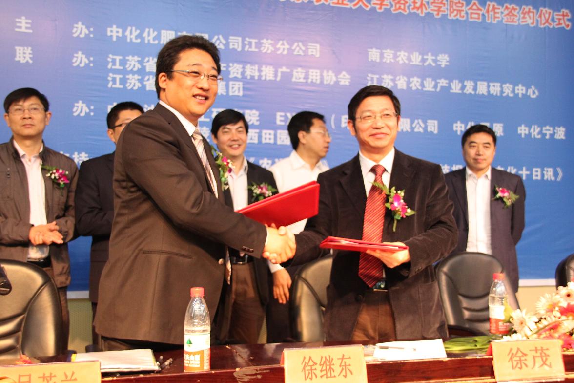 随后,李辉信代表学院与中化化肥江苏分公司总经理朱年祥签订合作协议,双方将携手建立科技创新、教学实践、社会实践和就业四大基地。
