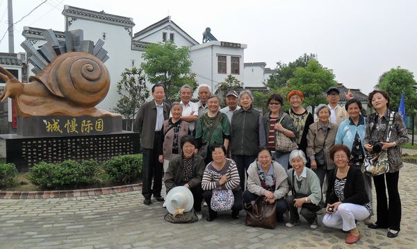早上7:30,退休教师登上前往高淳国际慢城的客车,历时两个小时到达高淳慢城。教师们兴致勃勃参观了高淳慢城。高淳慢城—桠溪生态风光带在2010年11月份苏格兰国际慢城会议上,被世界慢城组织正式授予“国际慢城”称号。高淳慢城建立了一种放慢生活节奏的城市形态,追求绿色生活方式,反污染,反噪音,支持都市绿化,支持传统手工方法作业,整个慢城没有看到快餐区和大型超市。退休教师们真正体会到“阡陌交通,鸡犬相闻”的景象。