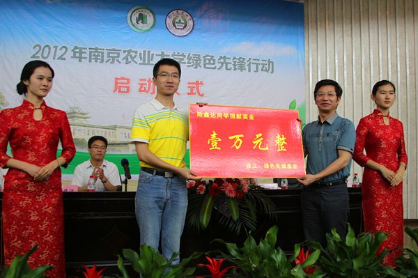 陆鑫达同学将其荣获的“Klaus Toepfer环境奖学金”(由前联合国副秘书长、前联合国环境规划署执行主任克劳斯·托普弗(Klaus Toepfer)教授在中国创立)一万元全额捐献给学校并设立绿色先锋基金,用于支持学生环保工作,表彰先进环保志愿者,李辉信代表18禁av