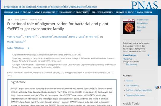 胡一兵副教授在青骨项目研修期间参与的细胞糖运输方面的研究工作取得重要进展,研究成果《Functional role of oligomerization for bacterial and plant SWEET sugar transporter family》(doi: 10.1073/pnas.1311244110)已于今年9月11日在线发表在美国科学院院报(PNAS,IF:9.7)上。其研究成果显示,原核生物存在与最近在真核生物中鉴定的、具有7次跨膜α-螺旋结构的糖运输蛋白SWEET类似的小分子蛋白——SemiSWEETs,这些SemiSWEETs只含有3次跨膜α-螺旋; 同时,他们证实慢生根瘤菌属的BjSemiSWEET1具有蔗糖运输活性; 并且这些SWEETs和SemiSWEETs需要形成二聚或多聚体才能完成其运输功能。 这项研究对阐明SWEET蛋白的结构及进化有重要意义。胡一兵副教授于2011年11月获得我校与国家留学基金委联合设立的青年骨干教师海外研修项目资助,到美国斯坦福大学卡耐基研究院进行了为期一年的访学工作。