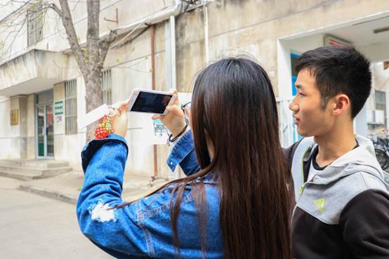 第一关卡——寻找相同字母。各组从玉兰路出发,按照抽取到的号码牌完成任务,最终回到起点记录各组用时。每组抽到的号码牌上有三个字母,在校园内找到与所抽到字母相似的图案拍照上传,即为任务完成。有的同学能很快地发现相似的字母完成关卡,也有同学迟迟找不到相似的图案而陷入“苦战”,但大家依旧兴趣高涨地进行着游戏。