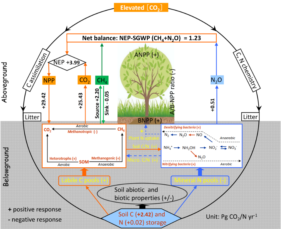 为科学解析上述“算术难题”,在国家自然科学基金、973项目和人才项目等资助下,邹建文教授课题组通过对全球1655组观测数据的集成分析,揭示了陆地生态系统碳氮过程对大气二氧化碳浓度升高的响应强度及其驱动机制。在此基础上,发现大气二氧化碳浓度升高导致陆地生态系统温室气体甲烷和氧化亚氮的年排放量增加了27.6亿吨二氧化碳当量,超过了土壤有机碳库增量(24.2亿吨二氧化碳当量),相当于每年陆地生态系统植被和土壤固碳总增量(39.9亿吨二氧化碳当量)的69%。因此,大气二氧化碳浓度升高背景下陆地生态系统温室效应很大程度上抵消了固碳效应。这是邹建文教授课题组近十年来三度在Global Change Biology(5年影响因子9.455)上发文后取得的新成果,对于科学评估陆地生态系统对气候变化的反馈效应具有重要科学意义和参考价值。