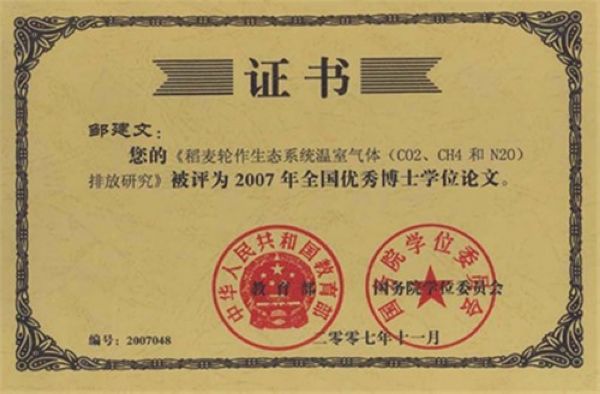 邹建文的博士论文(指导教师:黄耀教授)《稻麦轮作生态系统温室气体CO2CH4N2O排放研究》获2007年全国优秀博士学位论文