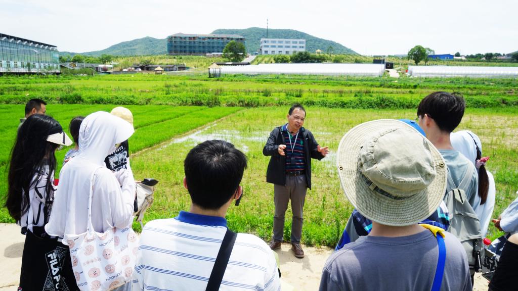 走到水稻田间,副院长郭世伟指着田里一片片绿意盎然的水稻苗说,“作为环境专业的学生,我们不仅学得要有深度,还要有宽度,‘要把饭碗端在自己手里’就必须解决‘卡脖子’的问题——提高土壤耕地质量,提高肥料利用效率,使天更蓝水更清。你们要把学到的知识运用到生产中,把论文写在大地上,这是我们学农业的人对世界和人类发展的贡献”。