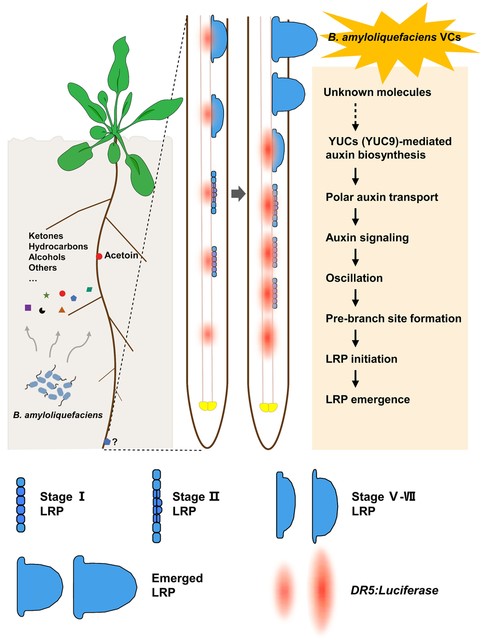 本研究提供了一个外部环境与内源机制协同调控植物侧根发育的模型,为利用根际促生菌及其代谢物质促进植物根系发育,提高根际养分的吸收利用,更好地发挥根际促生菌在减肥增效和农业绿色发展中的应用提供了理论支撑。