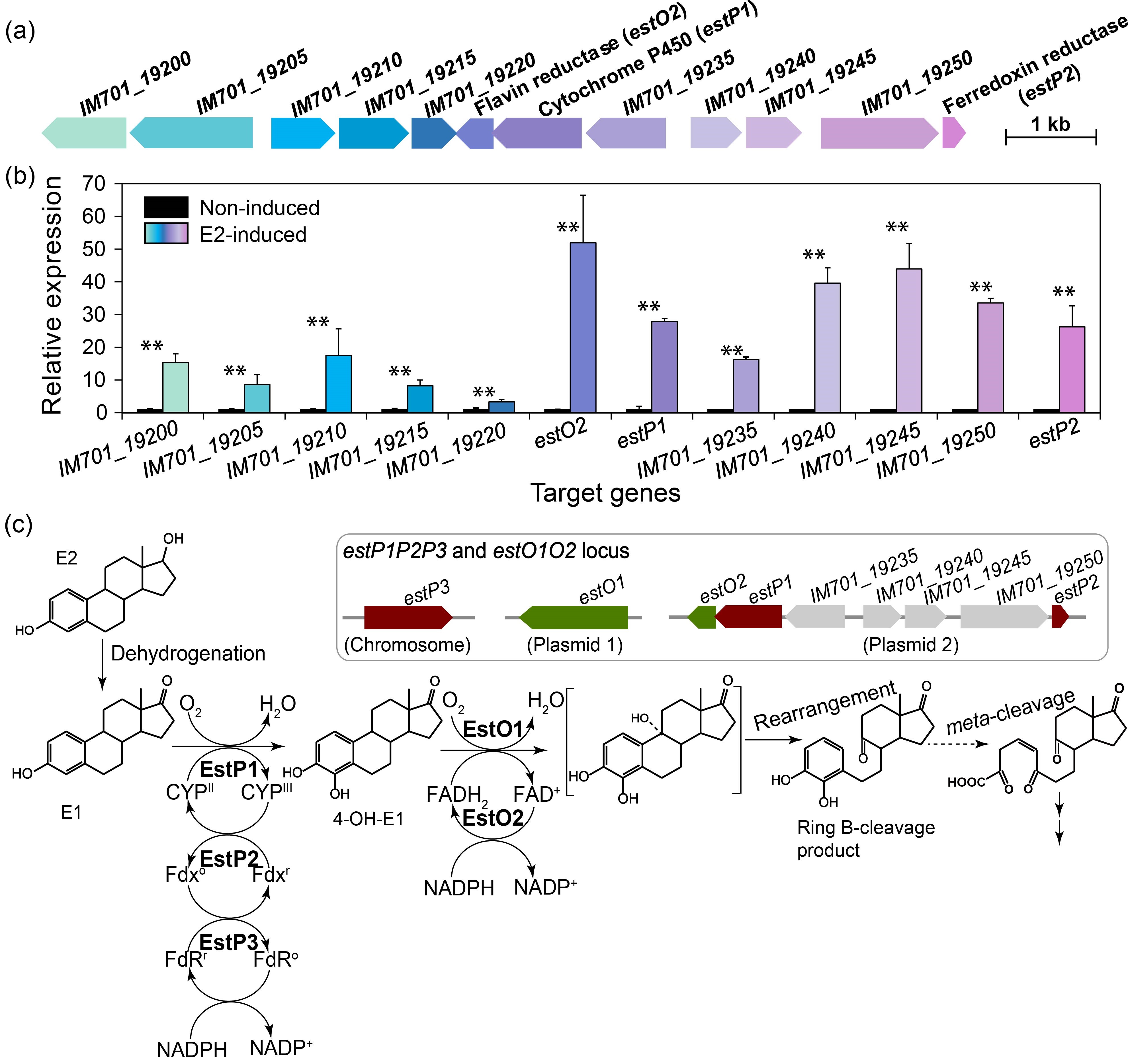 1. 菌株ES2-1中降解E2的基因及酶系。(a)与E2分解代谢相关的基因簇est。(bE2诱导下est基因簇中各基因的转录水平。(c)菌株ES2-1降解E2过程中的关键步骤及分子机制。