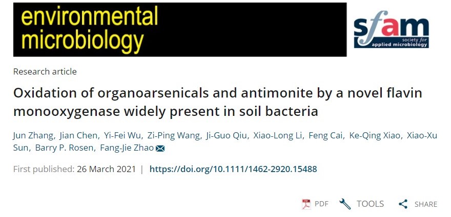 近日,该研究结果以“Oxidation of organoarsenicals and antimonite by a novel flavin monooxygenase widely present in soil bacteria”为题目在Environmental Microbiology在线发表。张隽副教授为论文第一作者,赵方杰教授为通讯作者。资环院蔡枫博士、硕士生吴亦飞和王子萍、广东省生态环境技术研究所孙晓旭博士、英国利兹大学肖可青博士、以及佛罗里达国际大学的Barry P. Rosen教授和陈健博士参与了部分研究工作。本项目研究得到了国家自然科学基金(41930758和31970108)等项目的资助。
