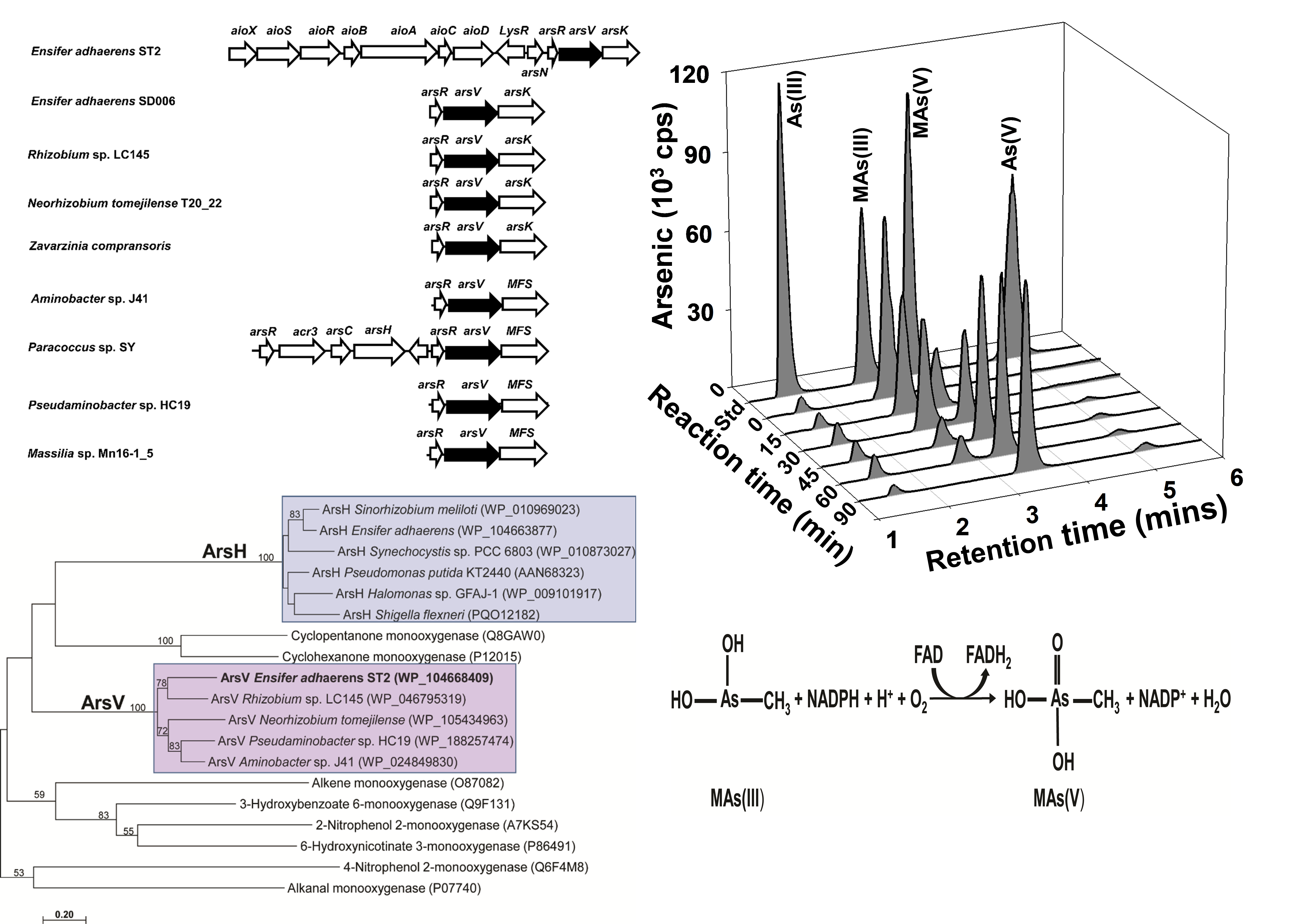 赵方杰团队从砷污染水稻土分离到一株耐砷的细菌Ensifer adhaerensST2,发现该菌株含有一个新的砷抗性基因簇arsRVK,其中编码的ArsV是一个具有未知功能的单加氧酶。异源基因表达实验表明,arsV基因可以赋予砷敏感大肠杆菌AW3110更高的MAs(III)抗性和氧化MAs(III)的能力。通过纯化蛋白的酶学实验证明,在NADPH和FAD或FMN存在的条件下,ArsV蛋白可以将MAs(III)氧化为毒性低的MAs(V)(图1),并且可以将三价锑[Sb(III)]氧化为毒性低五价锑Sb(V)。arsRVK基因簇存在于多种细菌的基因组中(图1)。通过对稻田土壤的宏基因组数据分析表明,arsV同源基因的丰度为0.12 ~ 0.25 ppm,与另一个已报道的MAs(III)氧化酶基因(arsH)丰度相似。这些结果表明,ArsV是一种新型的MAs(III)和Sb(III)的解毒酶,编码arsV的基因广泛存在于土壤细菌中。