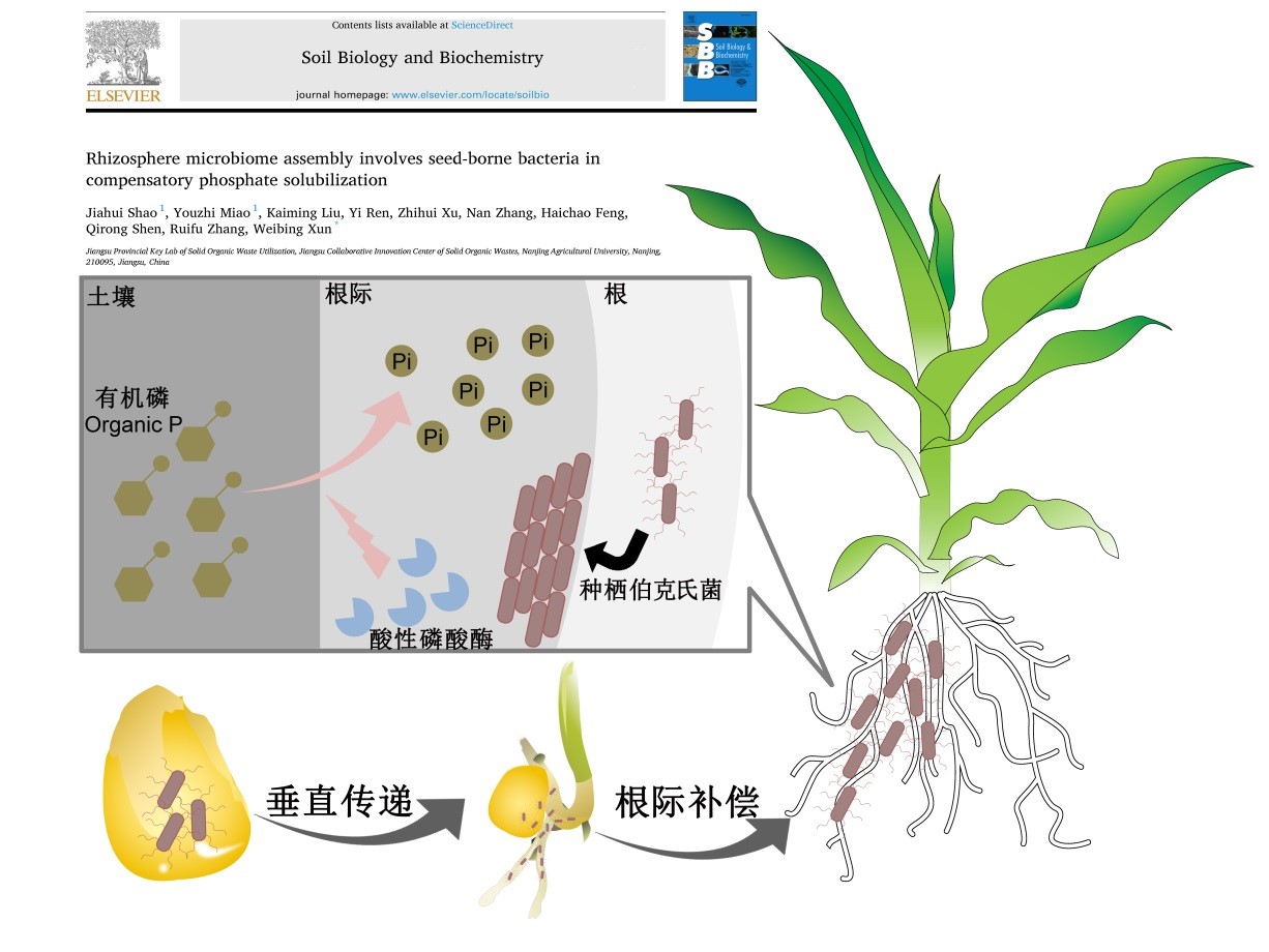 近日,土壤微生物与有机肥团队张瑞福教授课题组通过研究玉米种栖微生物在不同土壤养分条件下对子代作物根际微生物组结构和功能装配的影响,明确了玉米种栖细菌能响应土壤养分水平进行根际功能补偿装配的特征。结果表明在养分含量较高的土壤中,种栖微生物对根际微生物装配的影响较小;而在养分缺乏的土壤中,种栖微生物对根际微生物组装的影响显著提高。其中,在缺乏有效磷的红壤中,种栖唐菖蒲伯克氏菌能在玉米根际补偿定殖。基因组分析发现,唐菖蒲伯克氏菌基因组中存在三个编码胞外酸性磷酸酶的基因,结合定量PCR验证证明该胞外磷酸酶基因丰度与种栖唐菖蒲伯克氏菌在根际的补偿定殖强度吻合,研究结果证明玉米能感受土壤低有效磷水平,促进能合成胞外酸性磷酸酶的种栖唐菖蒲伯克氏菌在根际补偿定殖,增强根际溶磷能力,提高其根际磷素有效性。该研究揭示了种栖有益微生物通过垂直传递参与根际微生物组结构和功能装配的新途径,成果以“Rhizosphere microbiome assembly involves seed-borne bacteria in compensatory phosphate solubilization”为题发表在土壤学主流期刊《Soil Biology & Biochemistry》上。