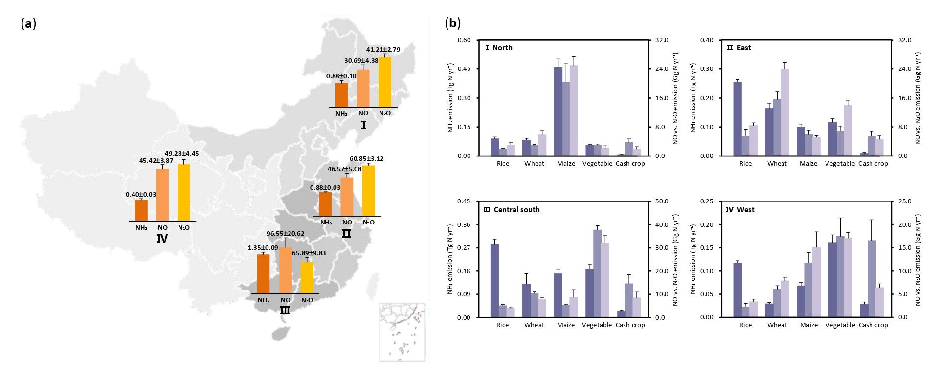 邹建文教授课题组通过对379篇文献的原位观测资料的集成与定量估算研究,辨析了中国农田不同氮肥管理生态系统NH3,NO和N2O排放系数的差异性特征,采用基于不同区域和作物类型的具体排放因子估算了中国农田活性氮气体排放总量及其对全球气候变化的影响。研究发现,我国来自于化肥和有机肥施用的Nr排放总量分别为3.81 百万吨N yr-1和0.73 百万吨N yr-1,分别占全球农业源NH3,NO和N2O排放量的23%,15%和20%。排放源主要集中在我国中南部和东部地区,其中,河南、江苏和湖北是前三大排放省份。而水稻、玉米和蔬菜三大作物生产的Nr排放量占全国农田化肥施用来源的Nr排放总量的61%。过去三十年间,NH3排放总体呈先上升后下降的趋势,而NO和N2O排放始终保持持续增长的态势。我国农田Nr排放对全球温变潜势 (GTP) 的贡献在不同时间尺度上呈现较大差异,但均表现为较强的增温效应。