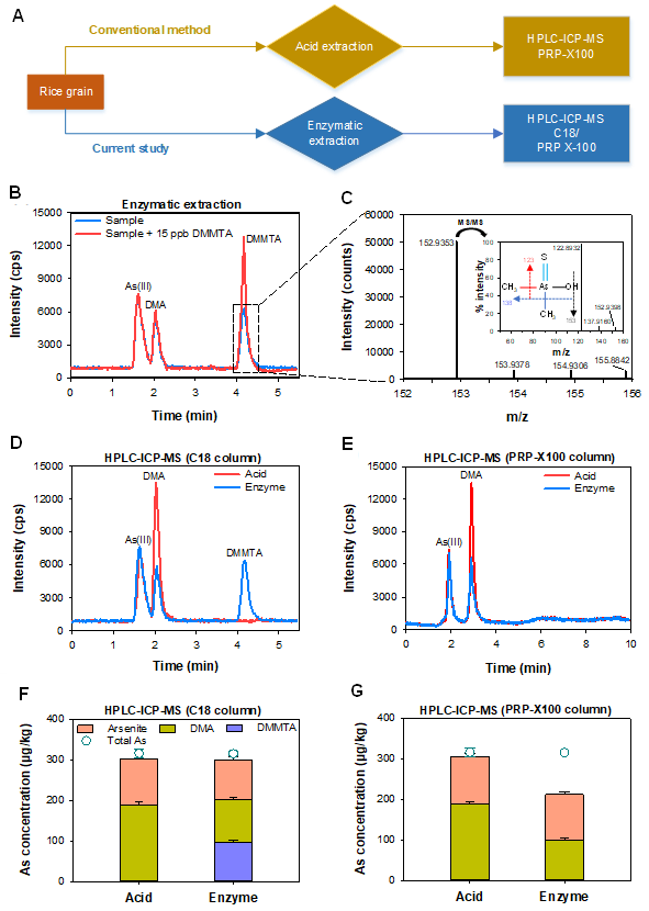 图1. 大米中二甲基一巯基砷的形态分离与定量分析。(A)大米中砷形态分析方法比较;(B, C)大米酶解提取液中砷形态分析的色谱图及物质结构鉴定质谱图;(D-G)大米酶解提取液和酸消解液的C18反相色谱柱或PRP-X100阴离子交换柱的色谱图和定量分析结果。