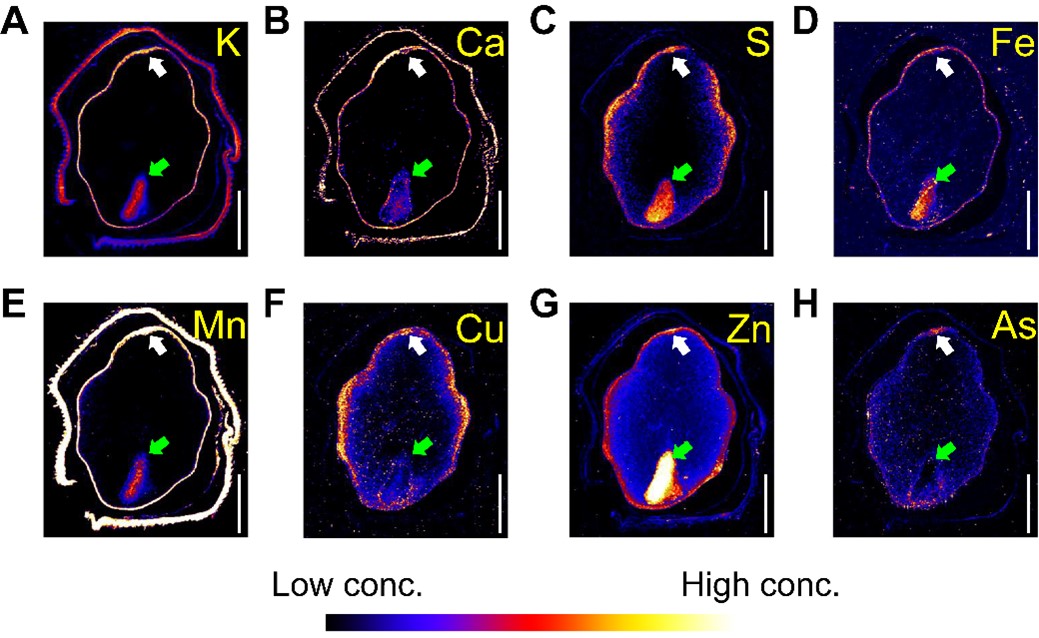 图2. 水稻籽粒横切面元素分布情况。白色箭头指向背侧维管束;绿色箭头指向胚。