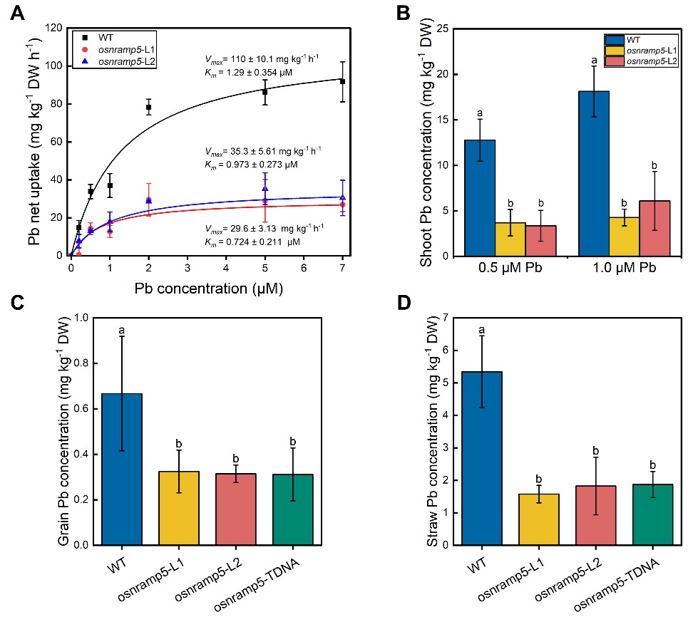 图1. (A) 水稻野生型(WT)和osnramp5突变体Pb吸收动力学曲线;(B) 水培条件下野生型和突变体地上部Pb浓度;(C, D) Pb污染稻田土壤盆栽试验中野生型和突变体籽粒和秸秆Pb含量