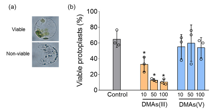 图2.(a)采用Evan’s blue染色检测水稻原生质体的活性;(b)DMAs(V)及DMAs(III)对水稻原生质体的毒性。