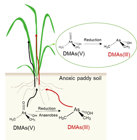 综上所述,该研究首次发现了稻田土壤和水稻植株中存在毒性很强的DMAs(III),水稻和很多土壤厌氧微生物具有将DMAs(V)还原为DMAs(III)的能力,导致其毒性加强。该研究拓展了对环境中砷的生物地球化学循环的认识,也为探究水稻“直穗病”的致毒机制提供了理论基础。
