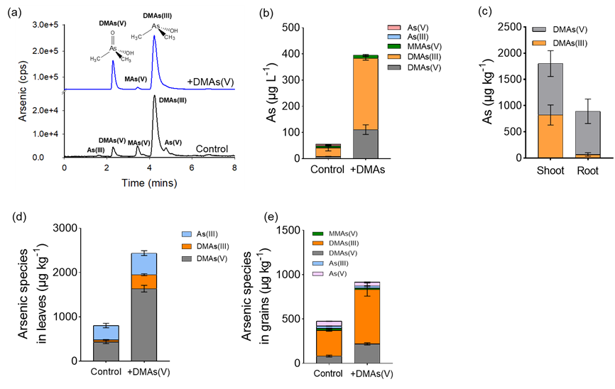 图1.(a)水稻土孔隙水中砷形态色谱图;(b)水稻土孔隙水中各种形态砷含量;(c)水培实验中水稻地上部和根部不同形态砷含量;(d,e)盆栽实验中水稻叶片(d)和籽粒(e)不同形态砷含量