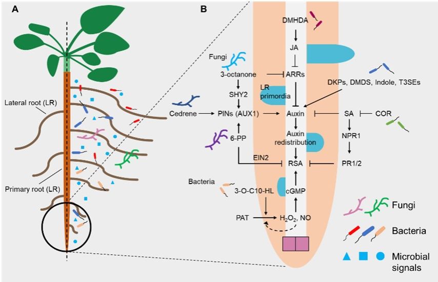 根系构型(Root System Architecture, RSA)是植物的重要性状,决定着植物对水分和养分的吸收。根际微生物作为植物的第二基因组,能够调控植物的根系构型,是促进化肥减施增效和农业绿色发展的重要因素。根际微生物通过分泌植物激素和信号分子参与或调控植物的根系发育,近年来,根际微生物调控植物根系发育的信号越来越多被鉴定,调控的分子机制和途径也逐渐被揭示。