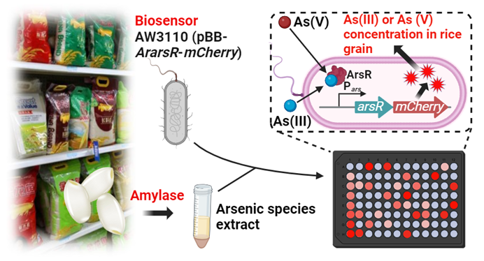 汪鹏教授课题组开发了一种稻米iAs检测新方法(图1),利用天然微生物传感器E. coli AW3110 (pBB-ArarsR-mCherry) 结合淀粉酶水解提取砷形态,实现稻米中iAs的高通量和定量检测。本研究将该生物传感器制成了操作便捷的试剂盒,包括酶标板、α淀粉酶,以及生物传感器细菌冻干粉。生物传感器被制成冻干粉可以提高该方法的使用范围、延长保质期、简化操作步骤和缩短测试时间(图3)。用该试剂盒在12 h内能检测超过200个稻米样品,而常规方法HPLC-ICP-MS在同样的时间内仅能测定40个样品。