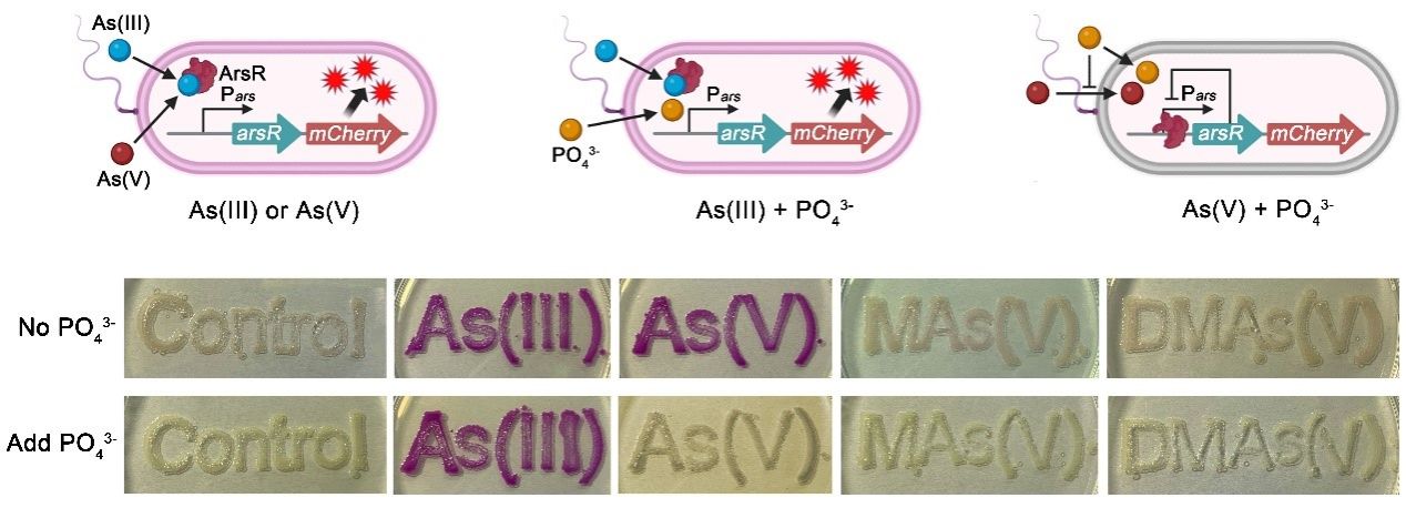 该生物传感器的传感系统来源于天然细菌砷抗性操纵子。微生物自诞生以来就一直生活在含砷环境中,并进化出了砷抗性ars操纵子,参与不同的砷解毒途径,比如ArsB为细胞As(III)外排蛋白,ArsC为As(V)还原酶,ArsM为As(III) S-腺苷甲硫氨酸甲基转移酶,ArsK为MAs(III)外排蛋白,ArsH为MAs(III)氧化蛋白。在没有As的情况下,ArsR蛋白与启动子上游的DNA结合区ABS结合,阻止ars操纵子转录。然而,在As存在的情况下,As(III)与ArsR蛋白结合,诱导其构象变化,从而降低ArsR蛋白对ABS的亲和力,ars操纵子的表达被激活。在本研究中,将mCherry基因连接到带有启动子的arsR基因(来源于对As(III)高灵敏的土壤细菌Arsenicibacter rosenii SM-1的ars操纵子)下游,并导入E. coli AW3110,mCherry基因的表达水平受ars操纵子的活性控制,与iAs浓度成正比,从而实现砷浓度信号到红色荧光蛋白mCherry的转换(图2)。该生物传感器对砷表现出高度特异性,只响应无机砷,不响应有机砷(图2),并通过调节检测体系中PO43-浓度来区分亚砷酸盐[As(III)]和砷酸盐[As(V)]。