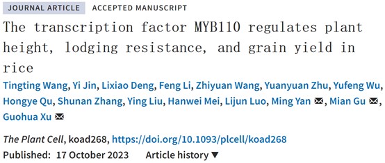 徐国华教授团队和上海市农业生物基因中心罗利军研究员团队在The Plant Cell合作发表了题为 “The transcription factor MYB110 regulates plant height, lodging resistance, and grain yield in rice“ 的研究论文。