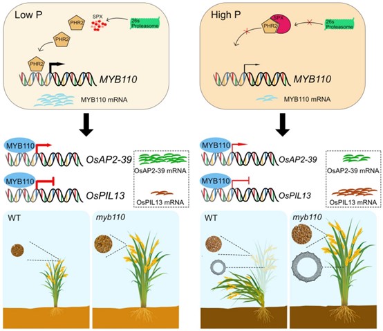 研究首先发现低磷胁迫和磷毒害均通过抑制水稻节间细胞的分裂以降低株高,继而筛选到一个受低磷胁迫诱导的水稻R2R3型MYB转录因子MYB110。该基因突变不影响磷素吸收和积累,却导致水稻株高显著增加且株高对低磷胁迫的响应减弱。进一步研究发现,MYB110是水稻磷信号转导网络核心调控因子OsPHR2的靶基因,受OsPHR2正调控并在其下游抑制水稻株高。有意思的是,myb110突变体虽然株高增加、茎秆木质素含量降低,但由于其茎秆相对野生型植株更为粗壮,因而具有更强的抗倒伏性。此外,myb110突变体在田间正常施肥和减施磷肥条件下均能通过提高每穗粒数和籽粒大小而增加产量。另一方面, MYB110存在两种主要的单倍型,其中单倍型1主要存在于籼稻,单倍型2主要存在于粳稻;虽两种单倍型都受低磷胁迫诱导,但单倍型1的表达量在对照和低磷条件下均显著低于单倍型2,并赋予水稻更高的株高。