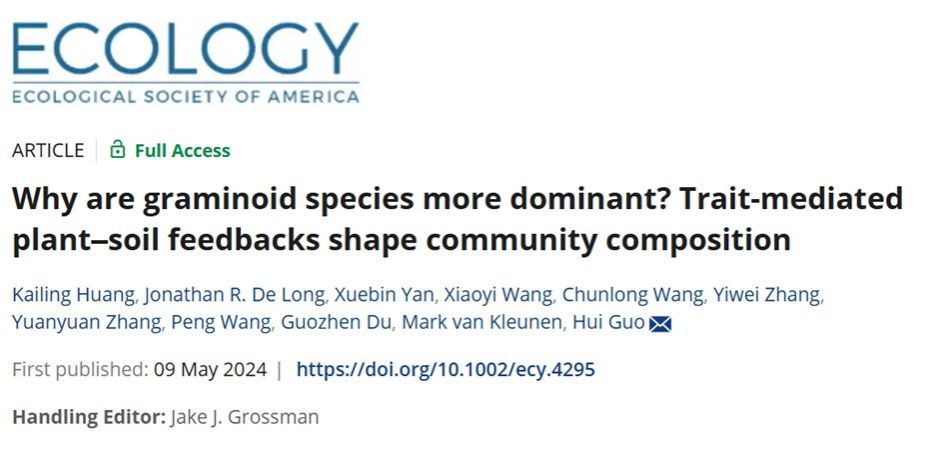 郭辉教授课题组在探究“植物-土壤反馈过程如何驱动植物群落组成”方面取得最新进展。研究成果“Why are graminoid species more dominant? Trait-mediated plant–soil feedbacks shape community composition”最近在Ecology上在线发表,并被选为当期的封面文章。