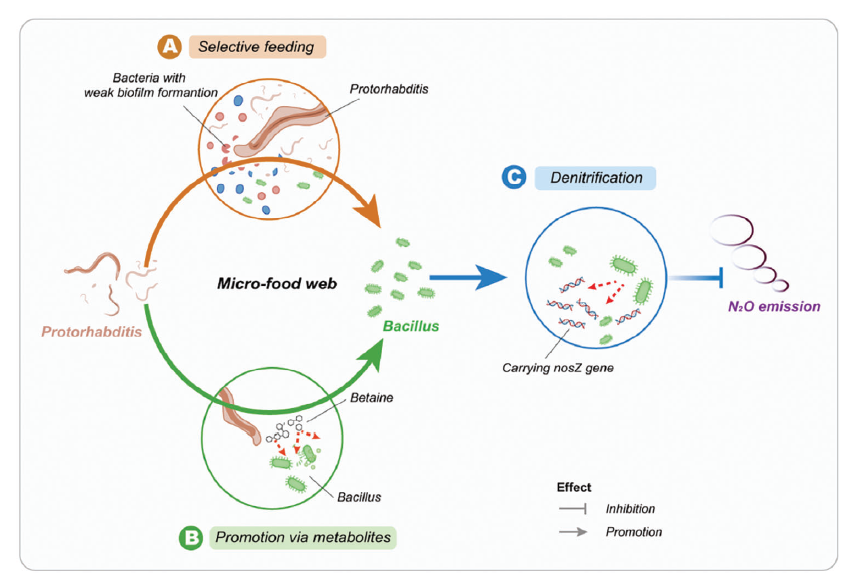 该研究团队通过微宇宙实验发现,去除农田土壤中的线虫群落造成土壤N2O排放的显著增加,而补充特定的食细菌线虫(原杆属线虫)则能降低N2O排放。研究进一步揭示了其作用机制:原杆属线虫能够改变土壤细菌群落组成,增加芽孢杆菌的丰度,并提升土壤中nosZ基因的表达水平。实验还发现,原杆属线虫不仅通过捕食调控细菌群落,还能分泌促进芽孢杆菌生长的物质,如甜菜碱,从而增强其N2O还原能力。这一发现为未来减少农业温室气体排放提供了新思路,也为可持续农业实践提供了新的科学依据。