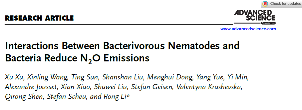 近日,沈其荣院士团队李荣课题组在土壤微动物线虫调控土壤微食物网促进养分循环降低温室气体氧化亚氮排放机制研究方面取得重要进展,成果以《Interactions Between Bacterivorous Nematodes and Bacteria Reduce N2O Emissions》为题发表于国际学术期刊《Advanced Science》。该研究深入解析了土壤捕食性线虫对微生物群落结构及相关功能的影响,揭示了食细菌线虫通过调控土壤细菌群落组成,促进土壤nosZ基因的增加从而降低N2O排放的作用机理。