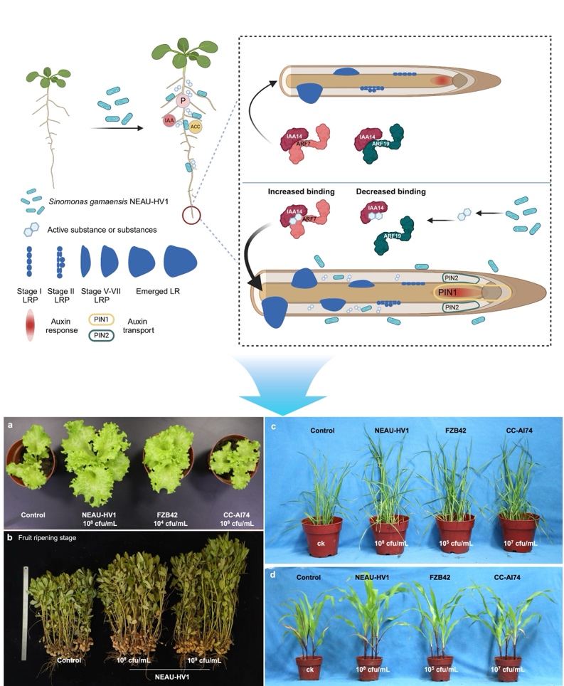 张瑞福教授与东北农业大学张继教授课题组合作在《New Phytologist》在线发表了“Sinomonas gamaensis NEAU-HV1 remodels the IAA14-ARF7/19 interaction to promote plant growth”文章,该研究分离了一株稀有菌属的根际促生菌株Sinomonas gamaensis NEAU-HV1,该菌株显著促进生菜、小麦、玉米和花生等作物的生长、根系发育和生物量积累,利用高通量绝对定量技术发现,菌株NEAU-HV1可以高效且稳定的定殖在生菜的根际和根内组织,并通过影响宿主植物内源生长素的信号和转运促进植物的侧根发育。利用酵母双杂交、微量热涌动和双分子荧光互作等实验发现菌株NEAU-HV1对生长素信号的影响可能归因于对植物内源转录因子IAA14和ARF7/19之间的互作重构。本研究为挖掘根际促生菌新资源、解析根际微生物调控植物根系发育机制提供新的理论基础。