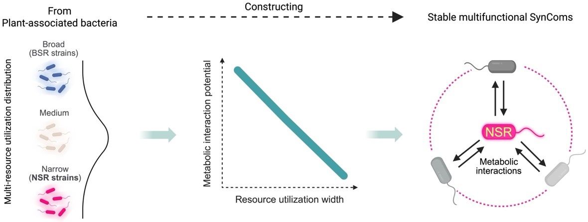 根际微生物被誉为植物的“第二基因组”,在土壤养分活化,植物促生以及病害防控等方面展现出巨大潜力,相关根际益生菌(群)在农业可持续发展中的应用价值日益凸显。然而,从众多具备植物特定益生功能的细菌资源中,如何构建功能多样且生态稳定的合成菌群,仍面临理论和技术相对缺乏的问题。