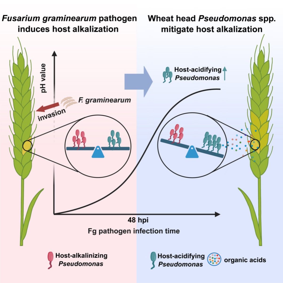 沈其荣院士团队熊武教授与植保学院高学文/顾沁教授团队合作,在微生物学领域国际权威期刊《Cell Host & Microbe》发表题为“Keystone Pseudomonas species in the wheat phyllosphere microbiome mitigate Fusarium head blight by altering host pH”的研究论文。小麦赤霉病是威胁全球农业生物安全的重大真菌病害。赤霉病菌侵染小麦时,会通过诱导寄主碱化来增强自身致病力。与此同时,小麦穗部的天然微生物群落中潜藏着一类能够“以酸制碱”的守护者——寄主酸化型假单胞菌。这些细菌在赤霉病菌侵入时被招募至麦穗,分泌有机酸降低病原菌诱导的寄主碱化效应,从而有效抑制赤霉病的发生。该研究揭示了寄主、病原菌与有益微生物间围绕pH的精妙博弈,并展示了通过调控寄主微环境实现作物绿色防控的新思路。