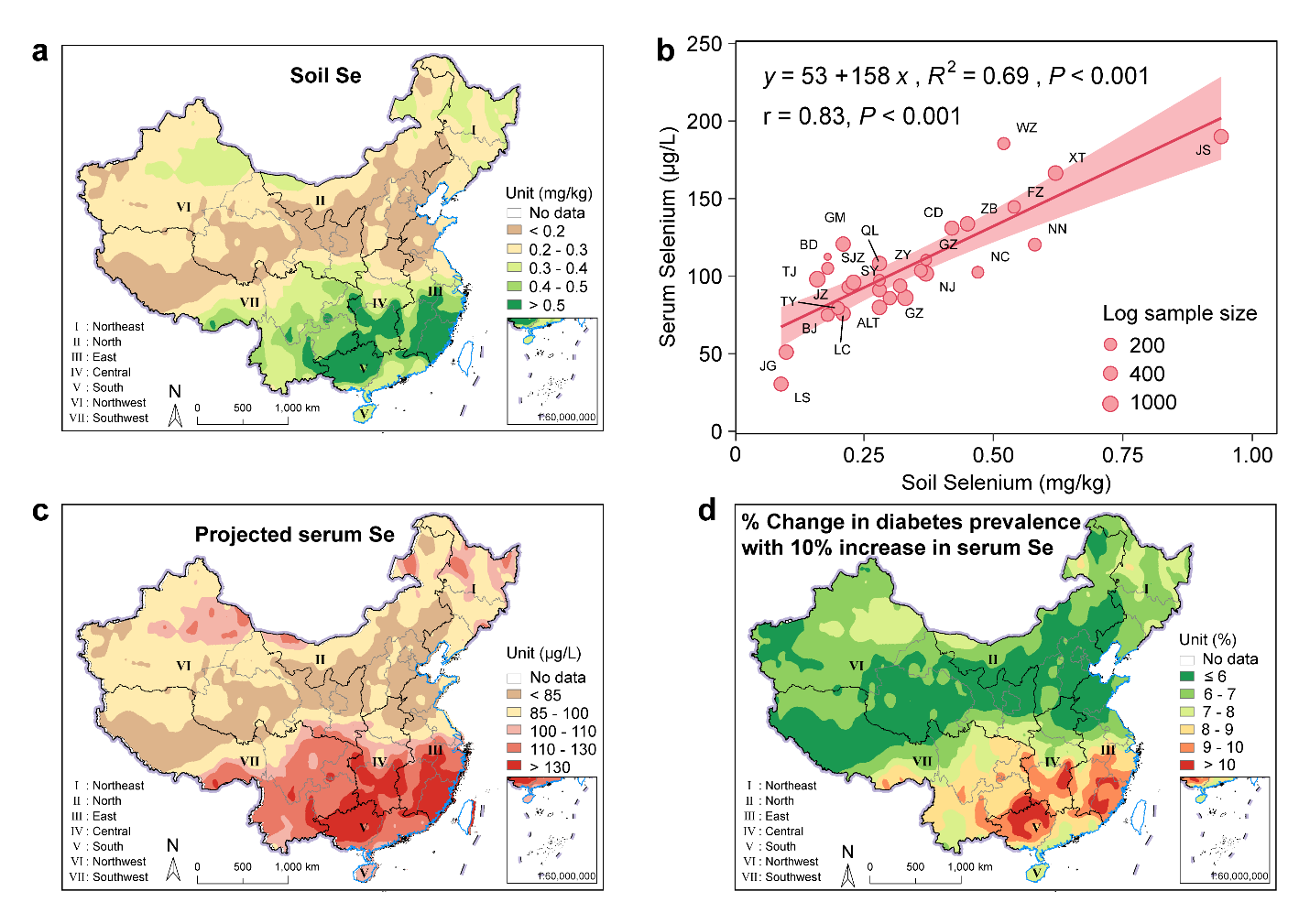 围绕这一问题,研究团队依托国家科技重大专项,对我国9省12地区17632人开展多中心队列调查,并对5195份生物样本进行了分析,结合横断面调查与前瞻性研究,系统评估了我国人群硒、锌、铬等微量营养状况及其与代谢性疾病的关系。研究发现,我国人群硒营养并非普遍不足,而是呈现明显的地域分异格局,总体表现为“东南偏高、西北和东北偏低”(图1)。其中,华南地区平均血清硒水平约为118.2 µg/L,而东北、西南、西北地区约为84.6-89.5 µg/L。全国约41%人口血硒达到或超过110 µg/L,主要分布在东南沿海和华南地区,约27%人口血硒低于85 µg/L,主要分布在东北、黄土高原和川藏高原等地区。进一步分析发现,土壤硒与人群血清硒呈显著正相关(R2 = 0.69),说明“土壤-农产品-人体”传递路径仍是影响居民硒营养状况的关键机制。