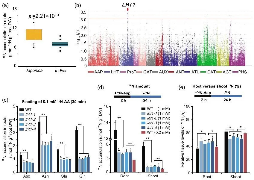 该研究发现,粳稻和籼稻均可以直接吸收氨基酸,但供试的粳稻品种根系对天冬氨酸的吸收能力平均约为籼稻品种的1.5倍。OsLHT1启动子区存在与氨基酸吸收关联的3个单碱基变异(SNP),在粳稻中的表达丰度显著高于籼稻。通过供试多种15N标记的不同浓度的氨基酸和无机铵,发现在异源酵母系统中,OsLHT1是一个底物非特异、高亲和(Km值为49-74 微摩尔/升)的氨基酸转运蛋白;在水稻中,OsLHT1功能缺失导致根系对氨基酸的吸收减少40-66%,同时大幅减少根系吸收及合成的氨基酸往地上部的分配转运,显著影响生长发育,降低生物量和籽粒产量。该发现有助于未来通过遗传改良水稻对氨基酸的吸收转运,提高水稻氮素利用效率和改善稻米品质。