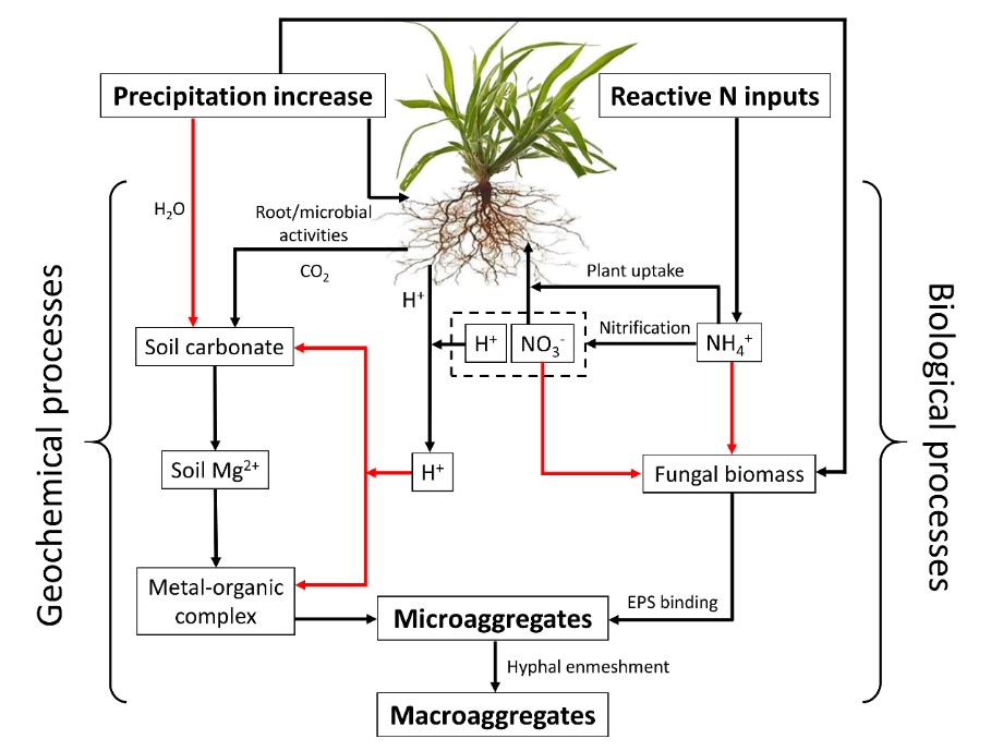 结果表明,在没有氮肥输入的情况下,降水添加主要通过增加土壤可交换Mg2+含量(化学机制)和促进真菌生长(生物机制),显著增加了土壤团聚体稳定性。然而,氮肥输入抵消了降水增加引起的促进作用,主要是通过抑制真菌生长、改变土壤pH值和粘粒-Mg2+-有机质桥接作用。此外,增温通过促进植物根来源碳的输入,以及抑制真菌生长和土壤呼吸作用,增加了矿物结合的有机碳含量。该研究为干旱和半干旱草原中多种全球变化因素控制土壤碳稳定性的潜在机制提供了新的认识,也表明以往完全基于单因素试验观测得出的研究结论可能存在一定的片面性和局限性。