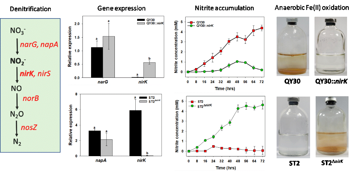 赵方杰课题组采用基因操作的方法,为回答上述问题提供了有力的证据。首先,他们从砷污染水稻土分离到两株反硝化细菌Paracoccussp. QY30和Ensifersp. ST2,在硝酸盐还原条件下,两株菌都能够进行厌氧As(III)氧化,但是只有QY30具有厌氧Fe(II)氧化的能力,可形成以水铁矿为主的棕红色沉淀(图1)。两株菌均具有编码As(III)氧化酶基因,并且其表达受As(III)强烈诱导。两株菌的基因组中均具有反硝化过程的所有基因,但是,亚硝酸还原酶基因nirK只有在ST2菌株中表达,而在QY30菌株中不表达,这就解释了ST2不积累亚硝酸盐,而QY30积累亚硝酸盐的现象(图1)。进一步对ST2菌株中nirK基因敲除,发现突变株ST2ΔnirK亚硝酸盐还原能力完全消失,亚硝酸盐在培养基中积累,同时突变株获得了厌氧Fe(II)氧化的能力。反之,将来自ST2的nirK基因导入QY30菌株时,重组菌株QY30::nirK获得了还原亚硝酸盐的能力,培养基中亚硝酸盐不再积累,同时其厌氧Fe(II)氧化能力完全丧失(图1)。但是这些遗传操作不影响两个菌株厌氧As(III)氧化的能力。研究结果表明,QY30和突变株ST2ΔnirK介导的厌氧Fe(II)氧化主要由亚硝酸盐对Fe(II)起化学氧化,是非生物过程,亚硝酸盐积累是Fe(II)氧化所必需的。而厌氧As(III)氧化是生物过程,不依赖于亚硝酸盐积累,反硝化过程为As(III)氧化提供电子受体。