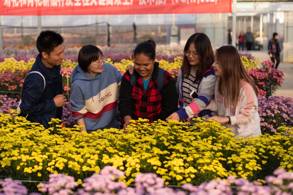 抵达湖熟基地,陈发棣带领同学们走进菊花温室,向同学们逐一介绍丰富的形态各异的菊花品种:“南农极点”“南农紫乒乓”“南农白蝴蝶”……这些由南农培育出的菊花品种深深吸引住同学们的眼球。随后,他又介绍说,学校许多菊花品种都得到了大范围的推广应用,尤其是在带动地区菊花食品加工、观光旅游、产业扶贫等方面发挥了重要作用,为地方经济社会发展作出了重要贡献。我校菊花等产业助力麻江扶贫工作也入选部属高校精准扶贫精准脱贫十大典型项目。班上的留学生思塔希感慨到:“陈老师介绍的这些菊花真的惊(艳)到我了,我也想把南农美丽的菊花带到我的家乡。”