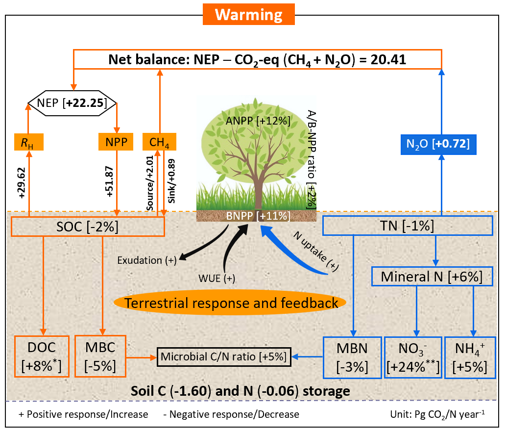 大气二氧化碳、甲烷和氧化亚氮等是引起全球变暖的三大主要温室气体。自工业革命以来,大气温室气体浓度增加引起的全球近地表温度平均升高了0.8-1.2℃,国际社会正致力于到本世纪末将温度增加控制在1.5-2.0℃以内。陆地生态系统碳氮生物地球化学循环在全球变化中扮演着重要角色,温度升高驱动着陆地生态系统碳氮循环过程,形成两者的响应和反馈效应。一方面,温度升高会促进陆地生态系统光合产物积累、增加陆地生态系统碳库储量,形成对气候变化的负反馈效应,减缓温室效应。另一方面,温度升高又会加速土壤有机碳的分解、促进陆地生态系统甲烷和氧化亚氮等温室气体排放,形成对气候变化的正反馈效应,加剧温室效应。因此,陆地生态系统对温度升高的响应强度和反馈效应成为近年来全球变化研究领域的前沿热点问题。