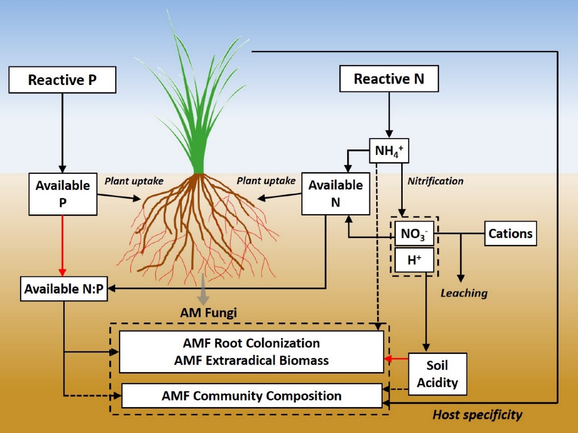 结果表明,磷和高浓度氮添加抑制AM真菌根内和根外生长,低至中等浓度氮添加则促进AM真菌生长。同时,以土壤酸化实验结果作为补充,阐明了氮、磷添加对AM真菌的不同影响机制:土壤氮磷化学计量比是AM真菌生长的主要调控因素,但高浓度氮添加引起的土壤酸化会抵消土壤氮磷比提高所产生的促进作用,抑制AM真菌的生长。基于这些结果,作者提出了N素添加导致的土壤酸化是抑制AM真菌生长的主要因素,而不是氮素营养本身。这一结论,不仅可以帮助理解前人研究中的多变结果,更有助于预测未来全球气候变化情景下AM真菌对植物和土壤碳平衡的影响。