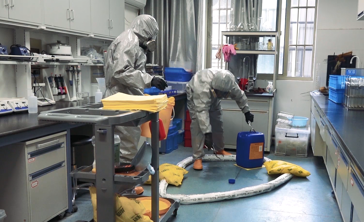 应急演练部分由江苏埃德伯格电气有限公司进行现场指导及讲解,模拟了有机废液桶打翻后,人员撤离现场、警戒疏散、事故有序上报、应急人员的个体防护、消除危险源、废弃物处理以及现场恢复等应急处置的全过程。通过演练,现场师生掌握了应急救援装备的正确使用方法,对如何高效、规范处置危化品泄漏事故有了生动和全面的了解,有效提高了自救和互救能力。